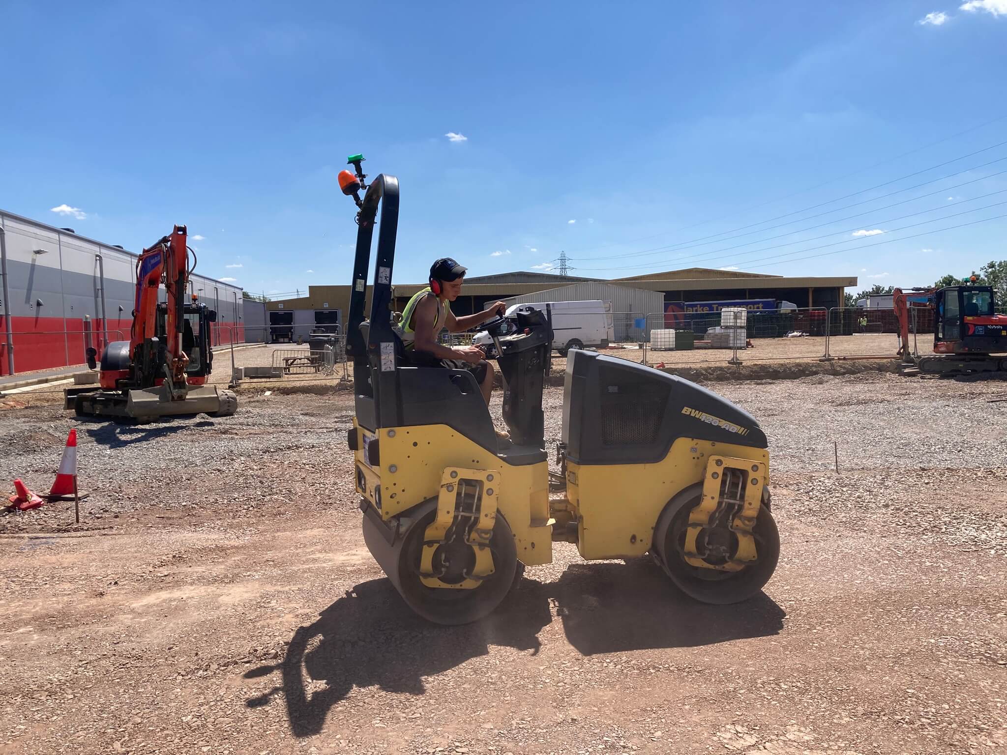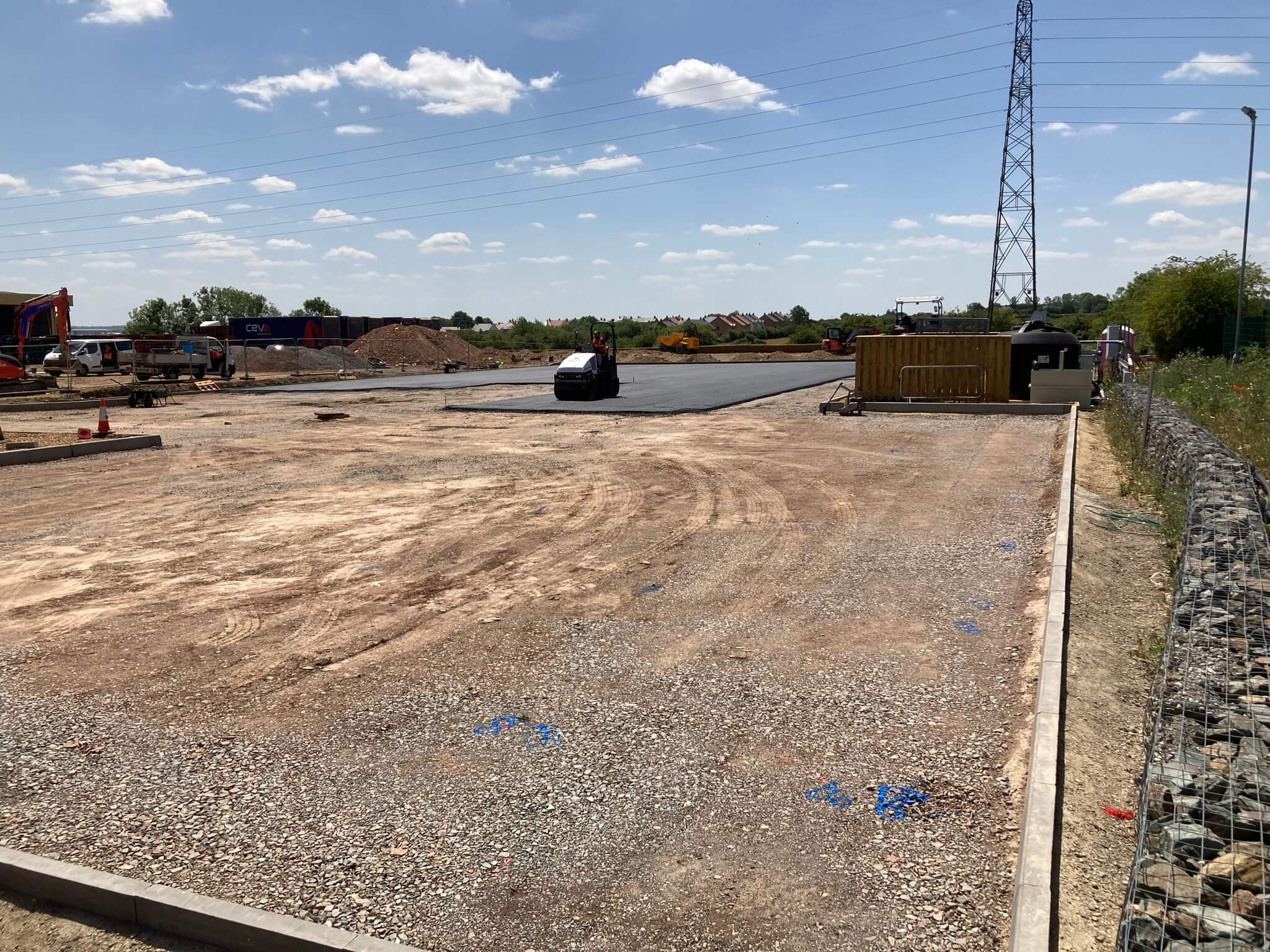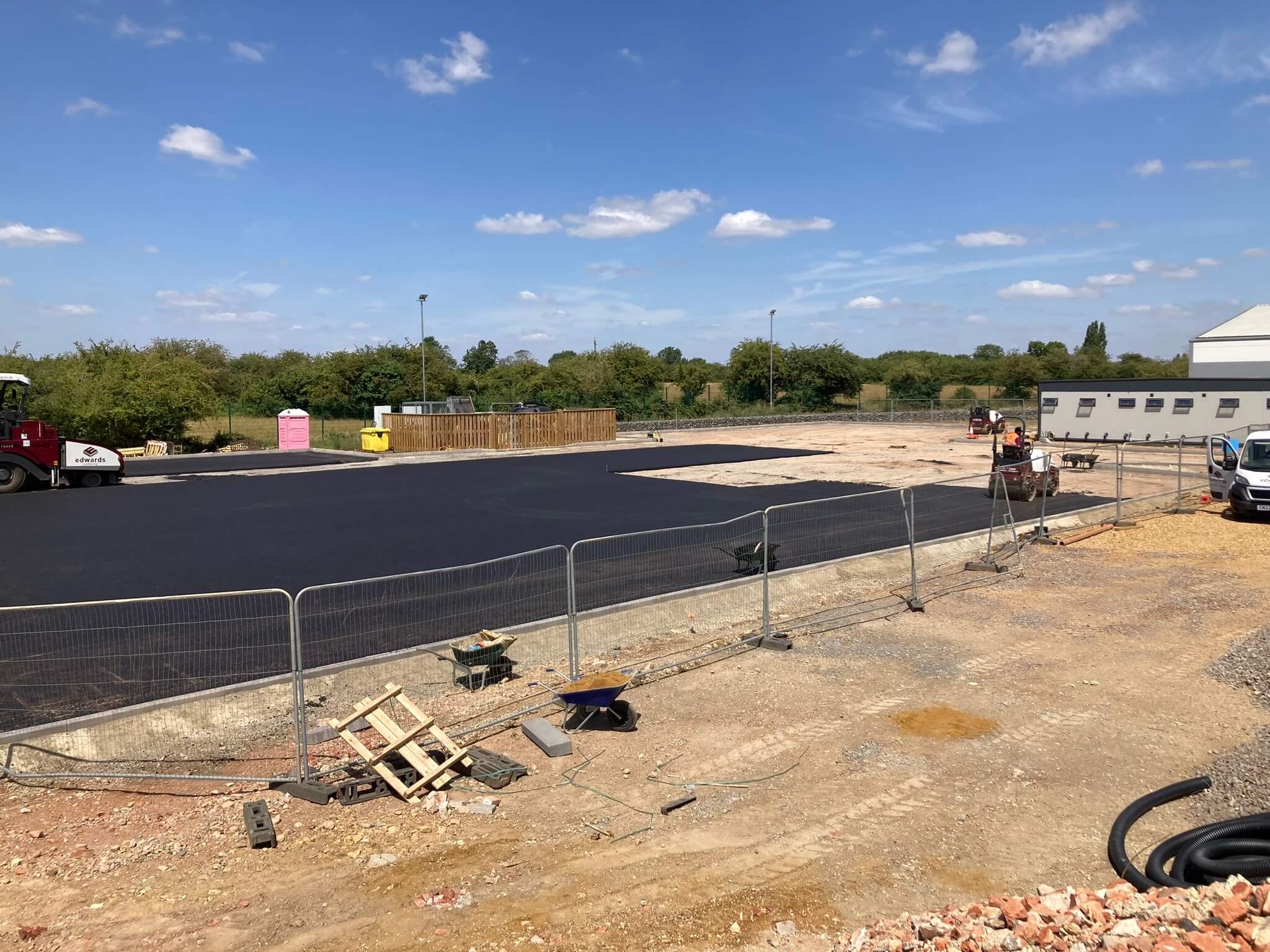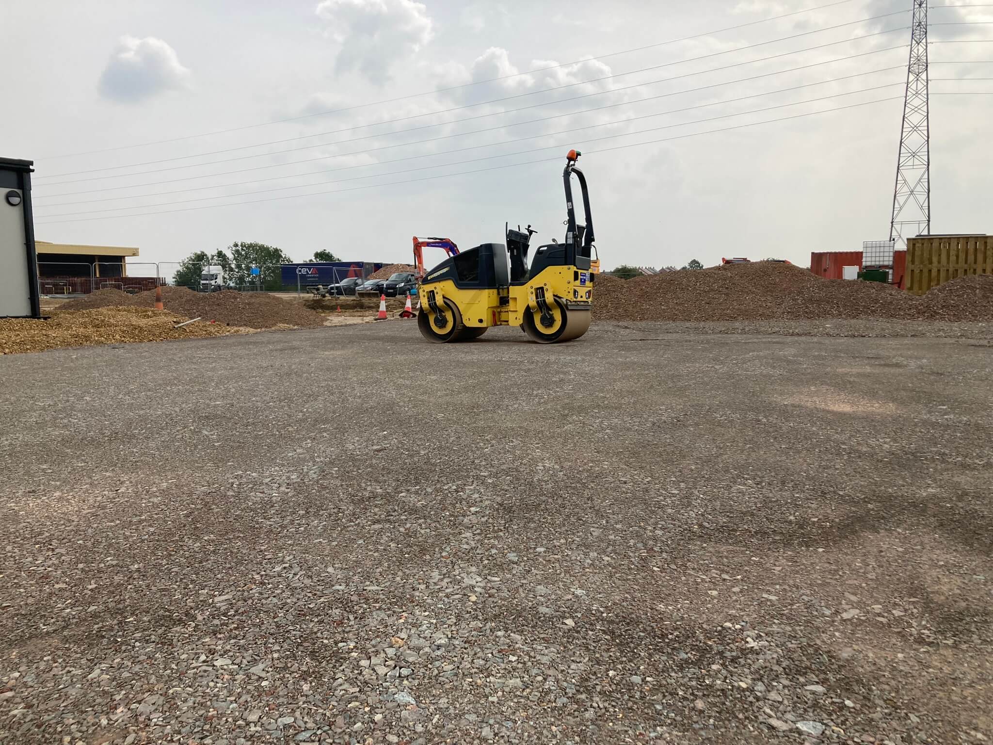 We started by clearing the site down the required level and gradients, and installing a mixture of HB2 & 6×5 kerbs to the perimeter. The existing sub base was good in most places, but still required a build up of 6F2 recycled hardcore, and then Type 1 Granite to finish, all continously rolled in layers to ensure zero settlement in the future.