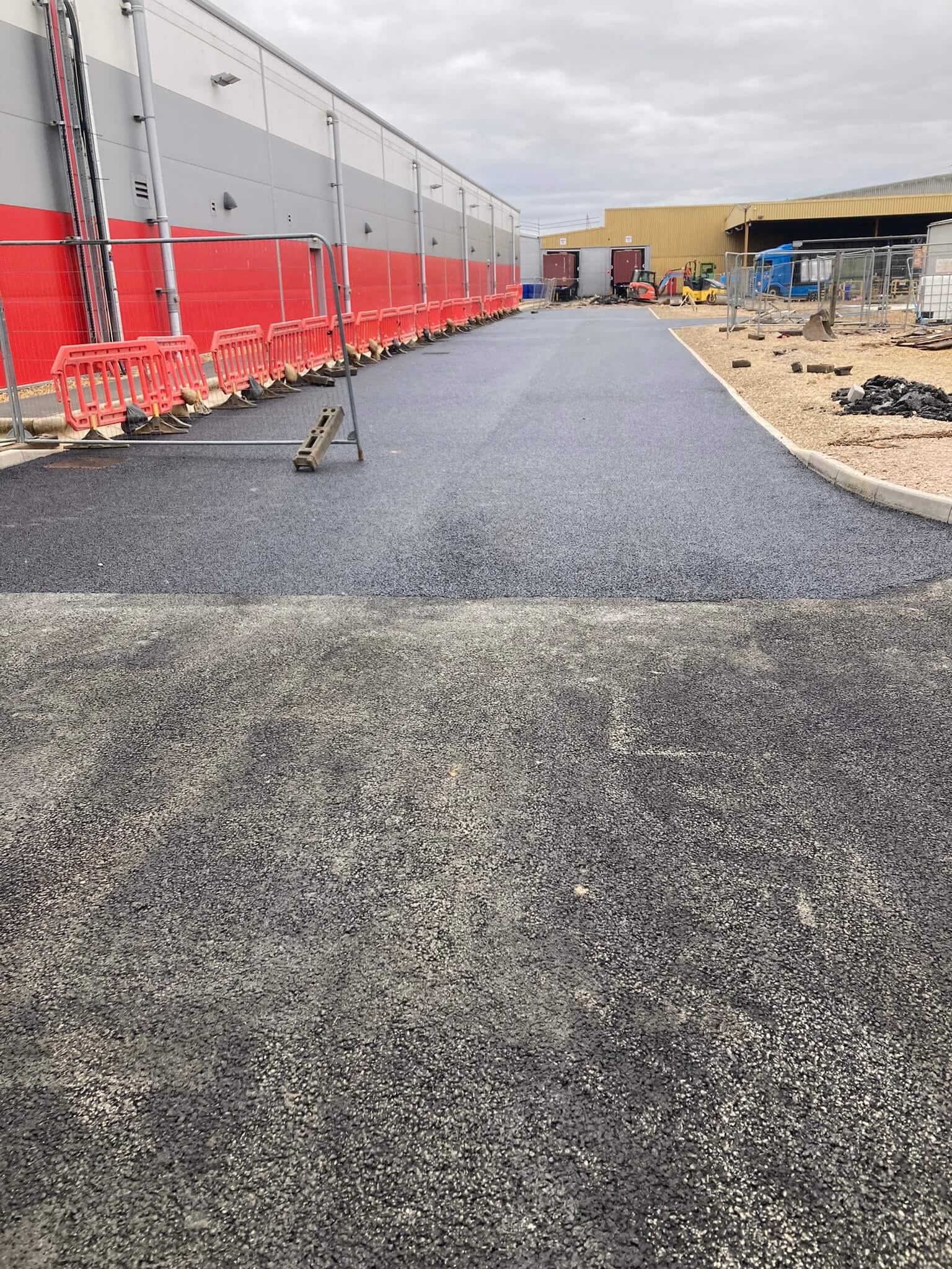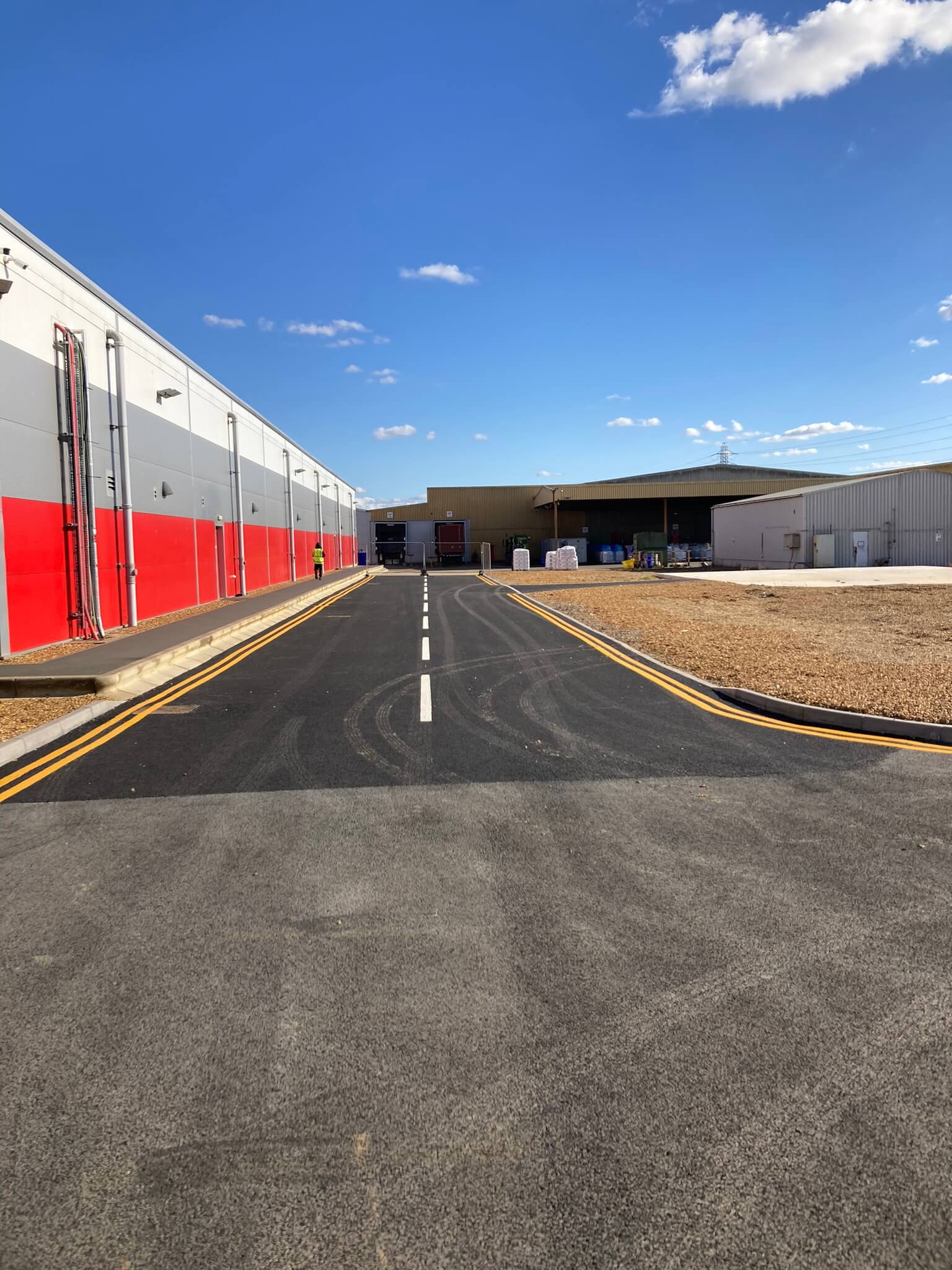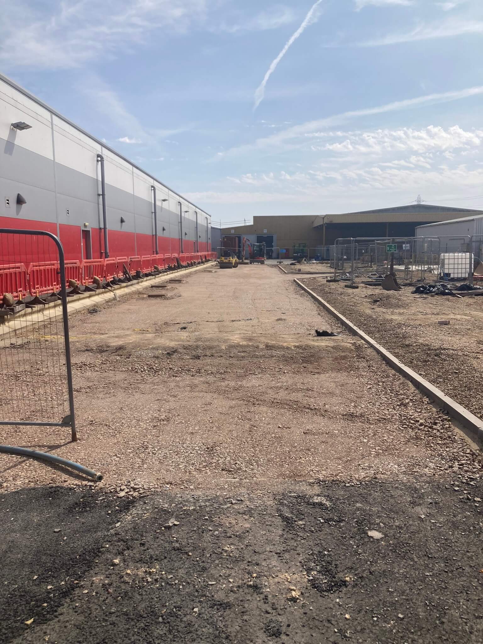 Our objective was to install a 7m wide concrete and tarmac road-way continuing on from an existing concrete area, linking up to a new car park at the back of the factory complex, to enable further parking for their expanding operation and also enabling employees to park closer to their place of work.