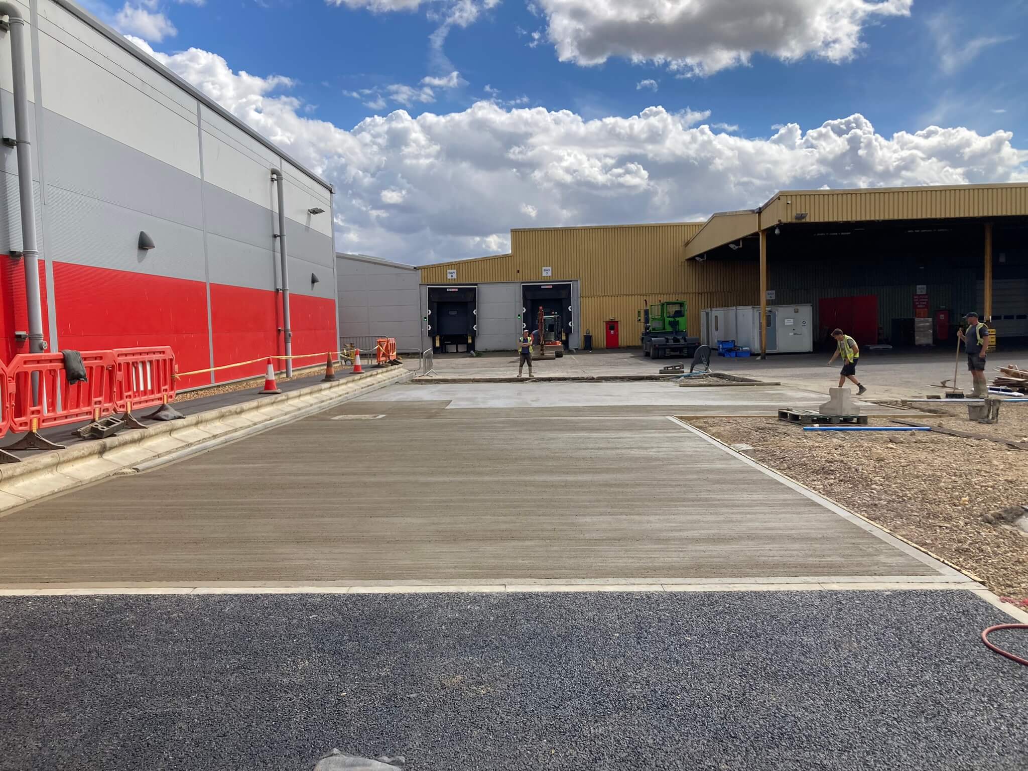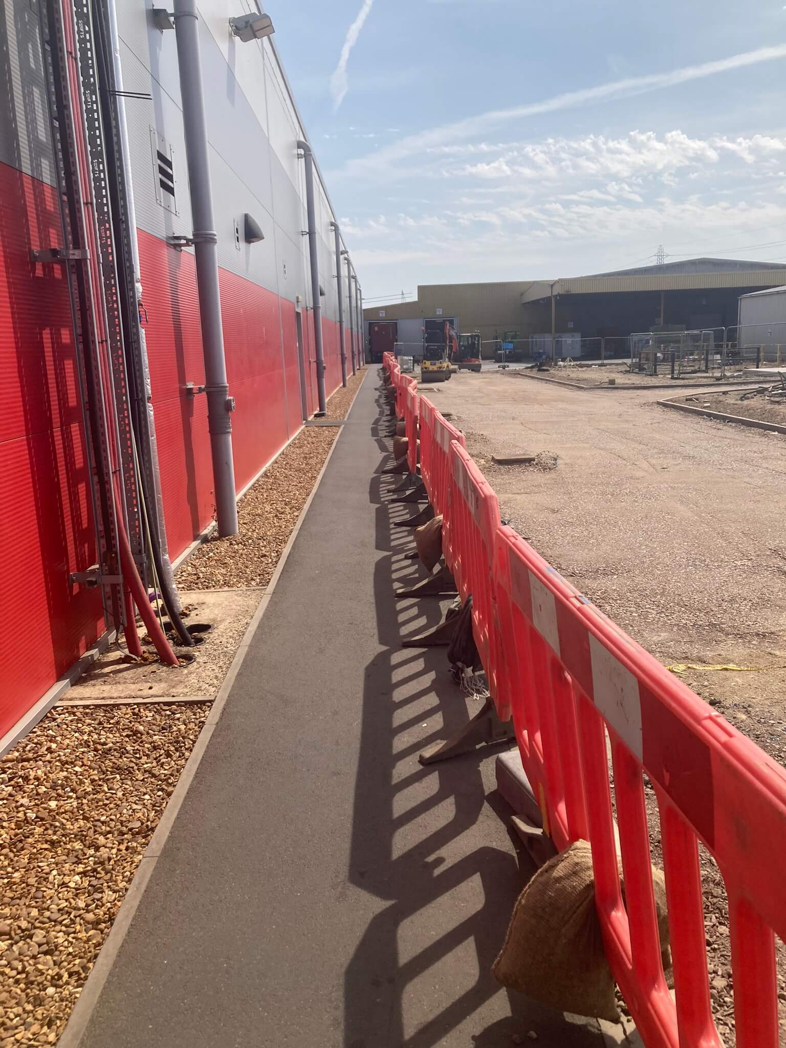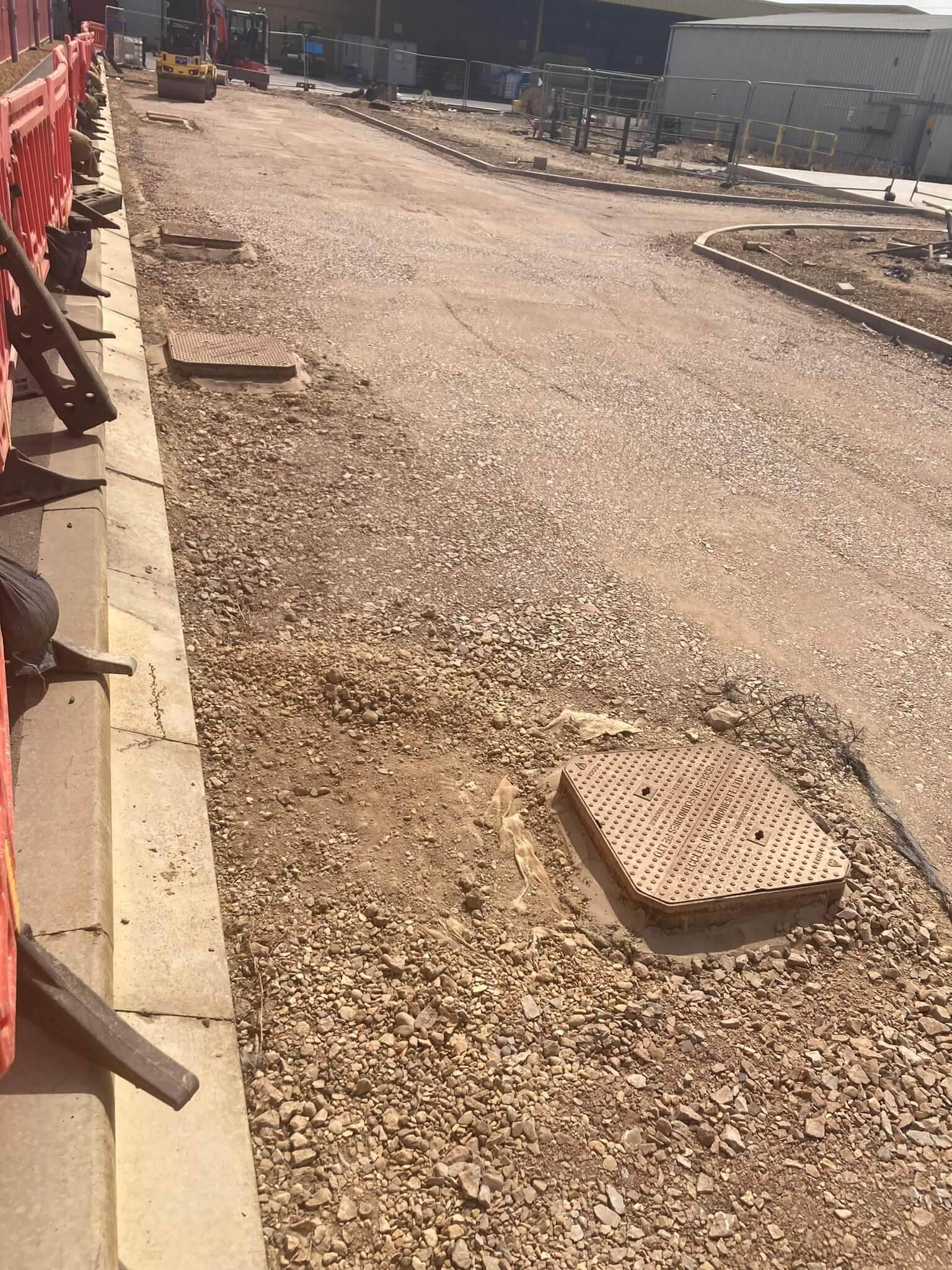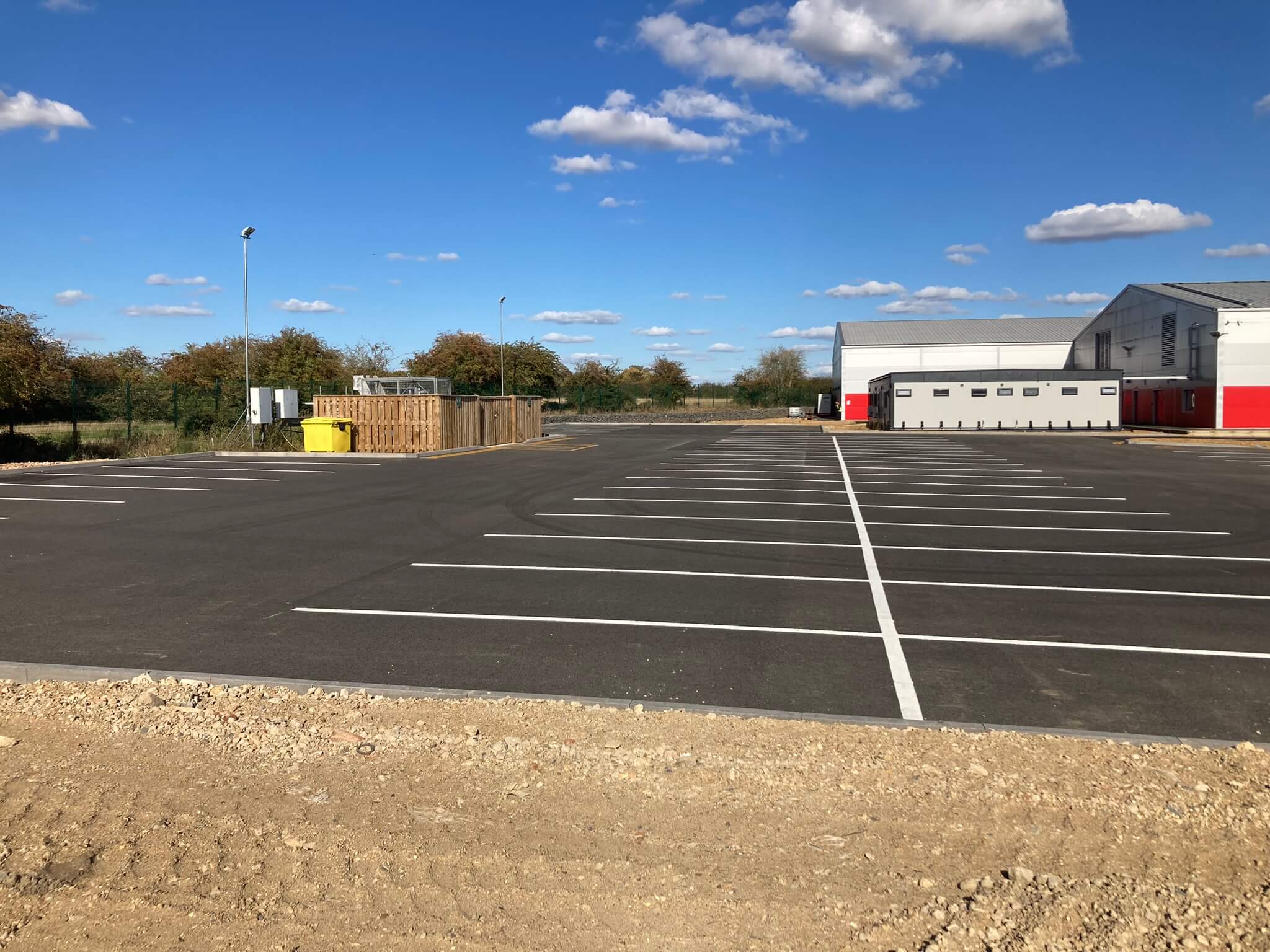 Our objective was to install a 7m wide concrete and tarmac road-way continuing on from an existing concrete area, linking up to a new car park at the back of the factory complex, to enable further parking for their expanding operation and also enabling employees to park closer to their place of work.