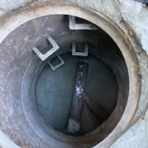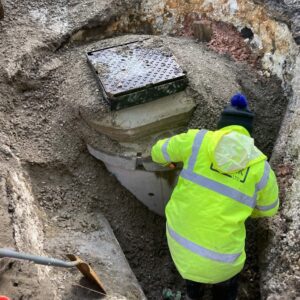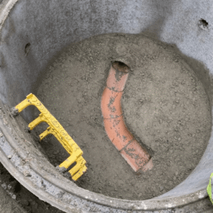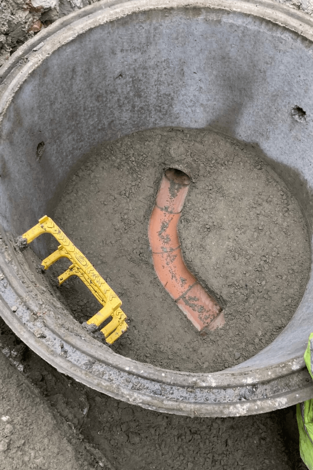 The picture to the right shows rough benching of one of the manholes, in advance of it being smooth-benched with a granite & cement mix, and then finished with a manhole ‘biscuit’ and D400 cover.