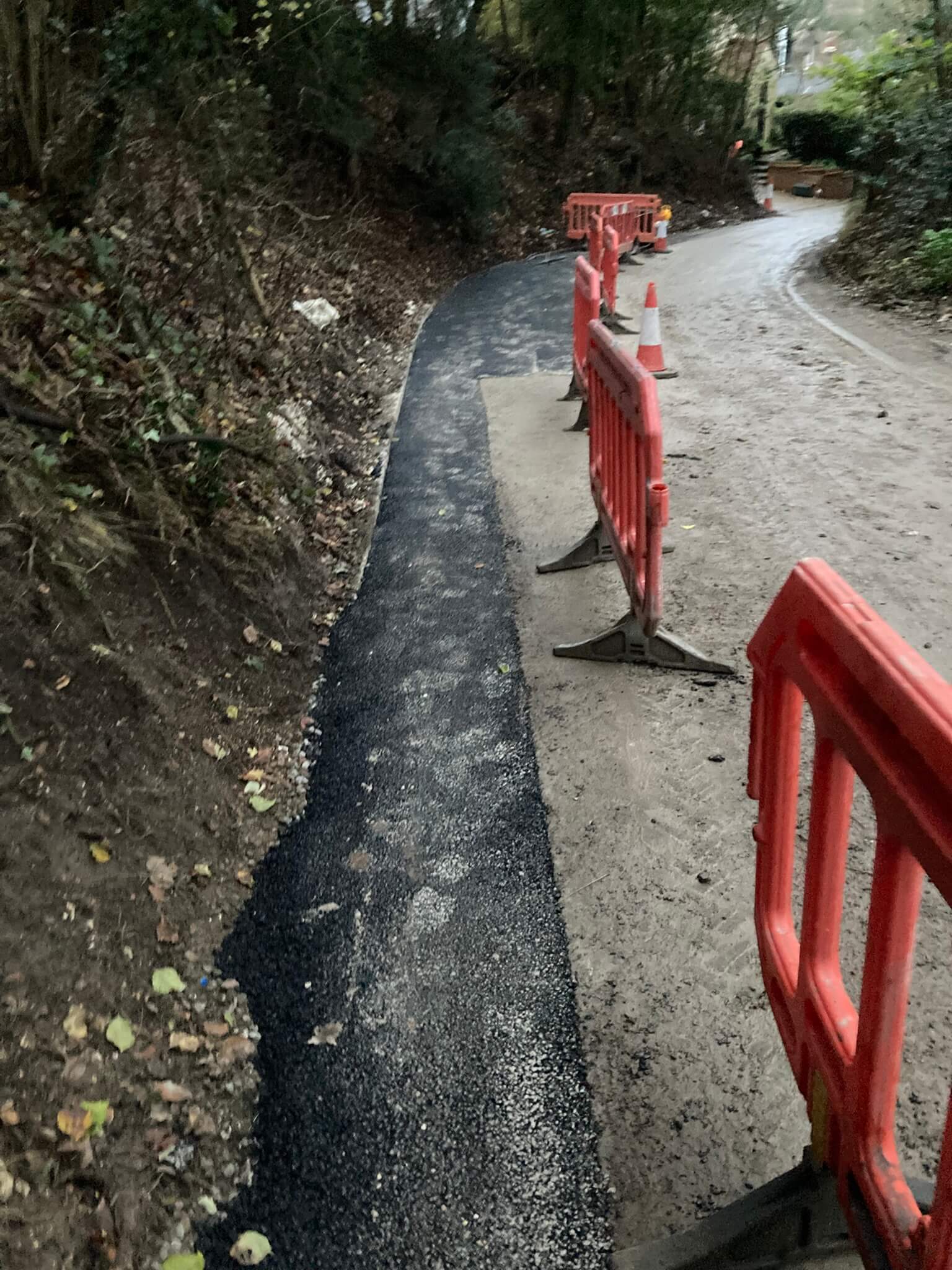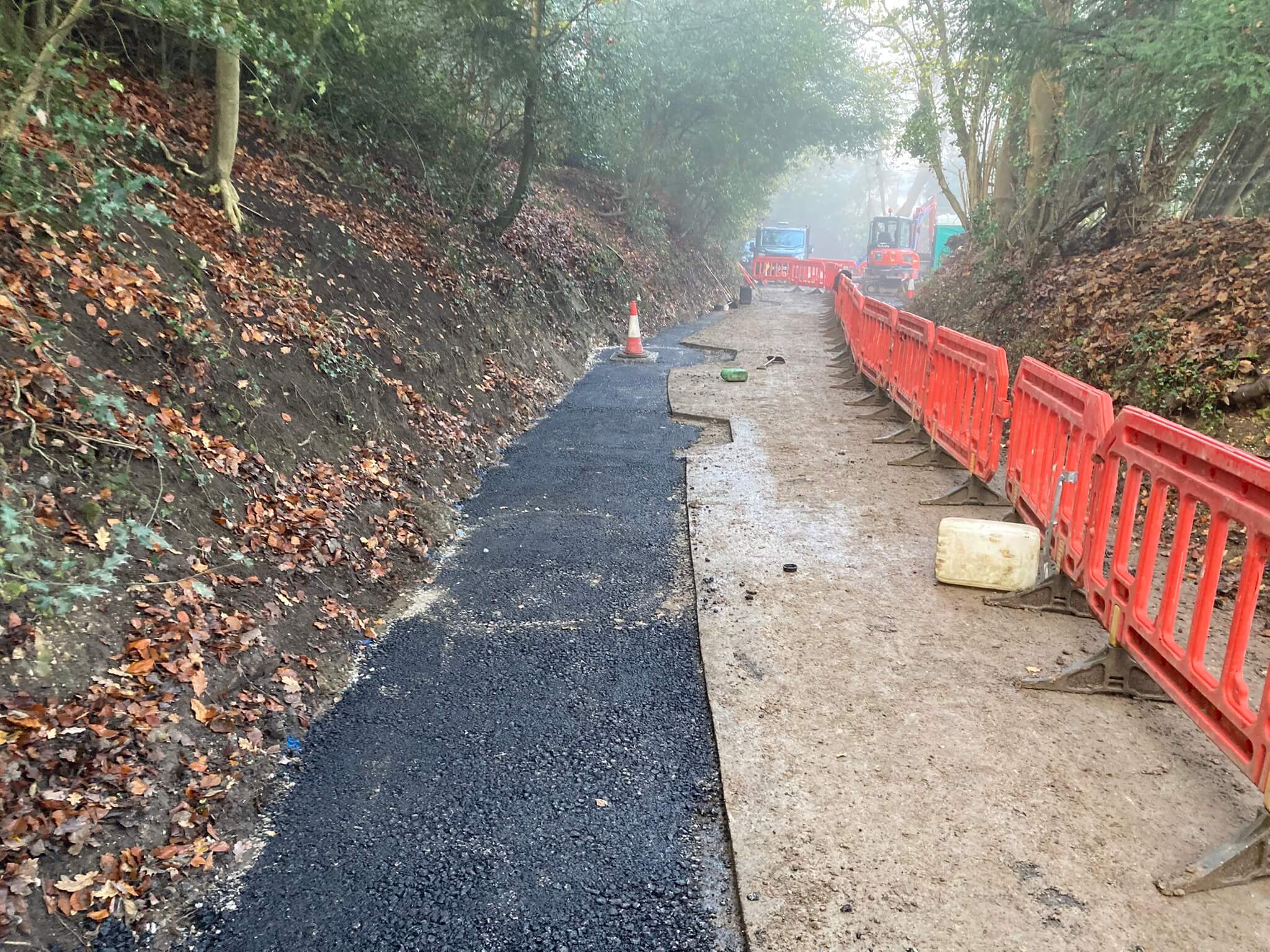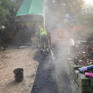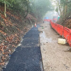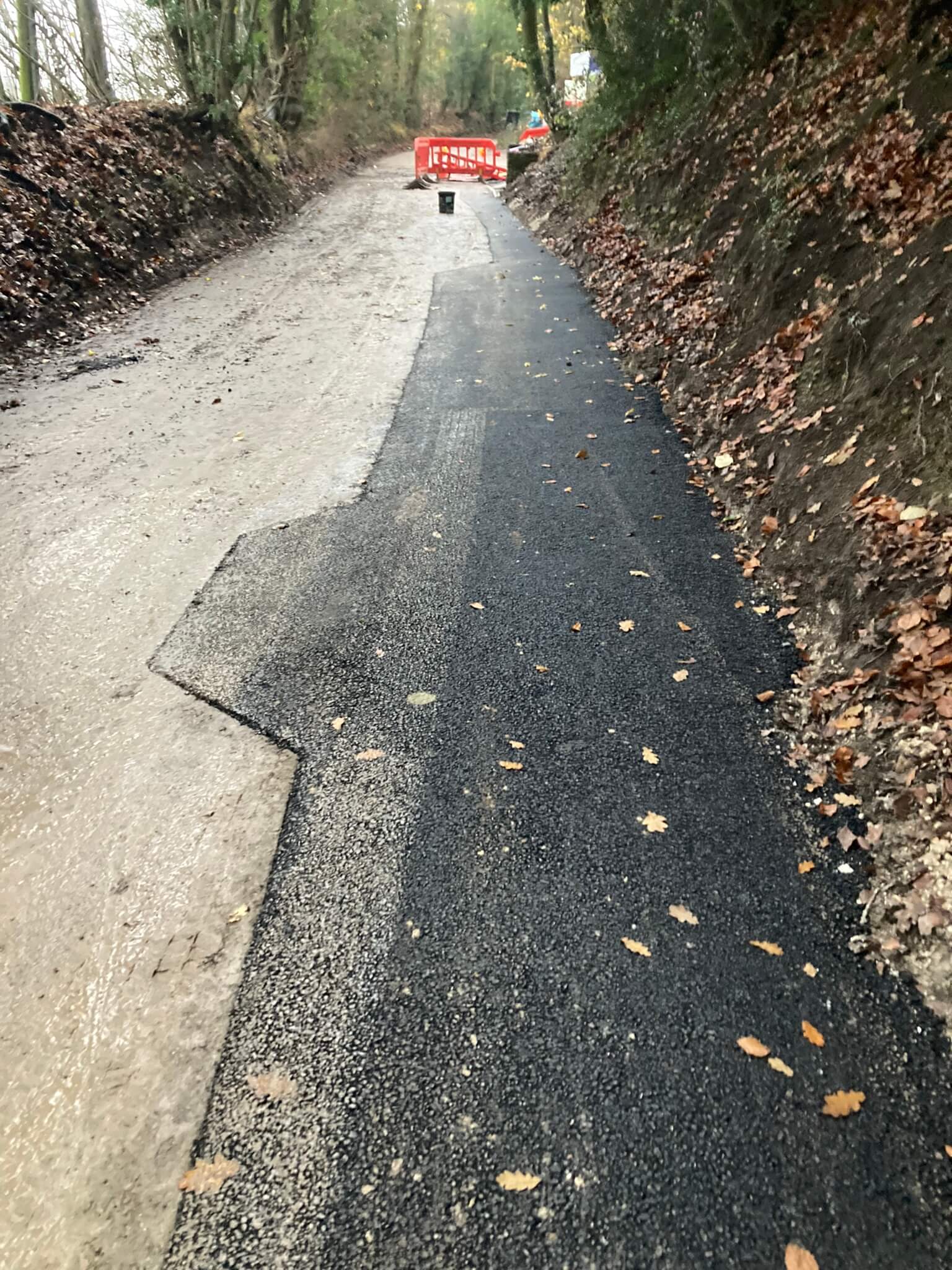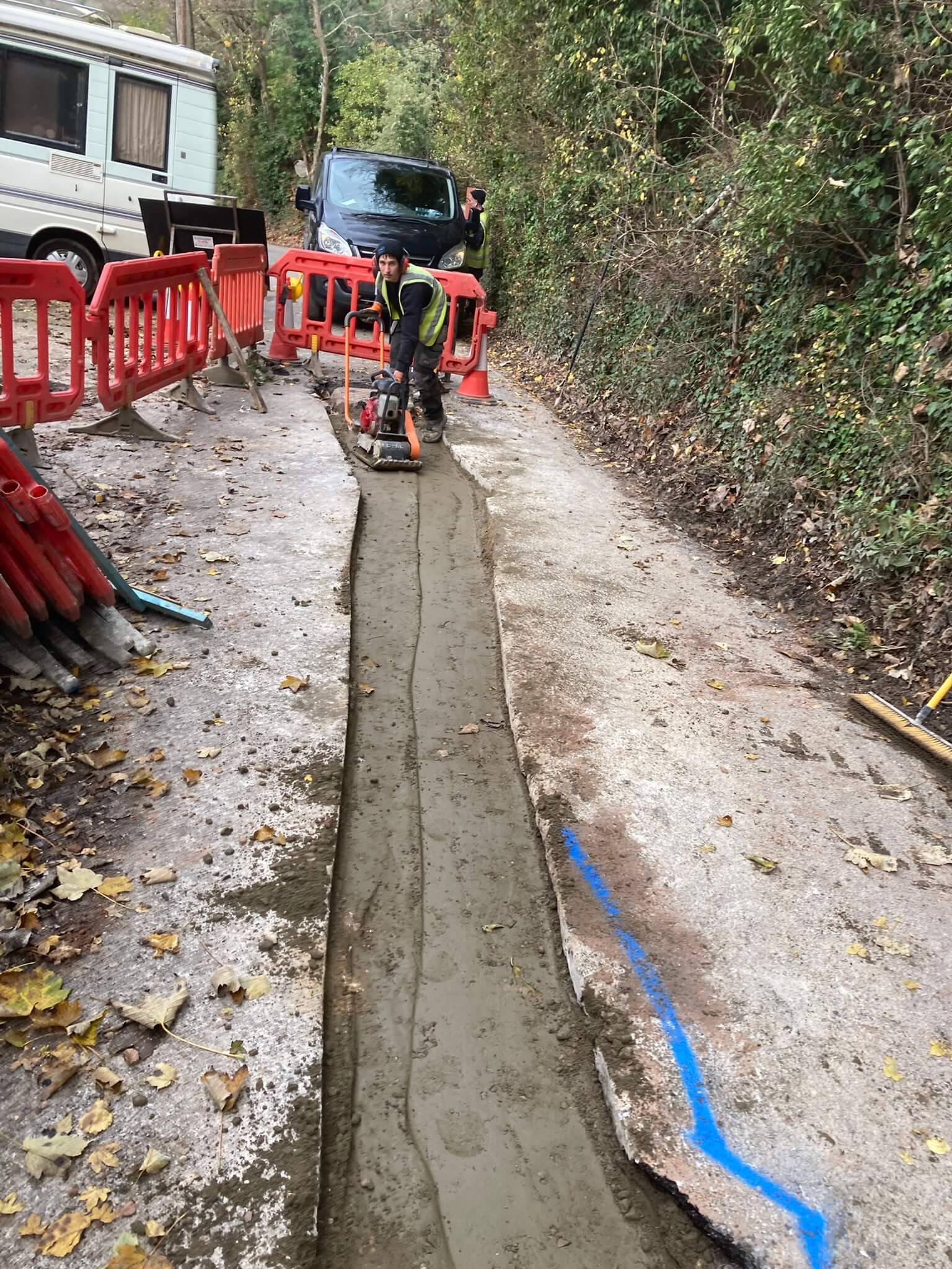 The road was a ‘composite’ road, i.e. there was concrete underneath the tarmac surface course, therefore we had a layer of concrete to put back between the sub-base and the top tarmac course. This added time to the job as the concrete not only had to be laid and compacted, but also had to ‘cure’ before tarmac could be laid on top. With the concrete cured, we finished the road with 10mm tarmac wearing course, as per the Highways spec for the relevant class of road.
