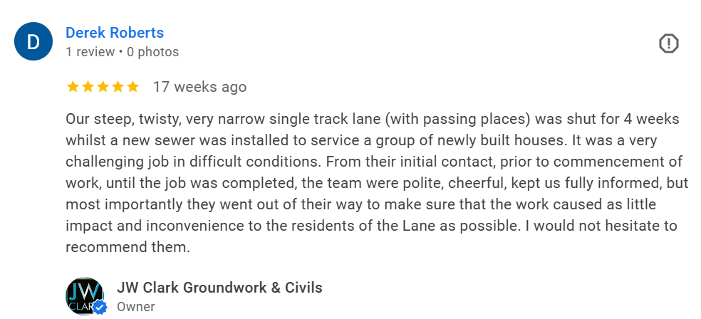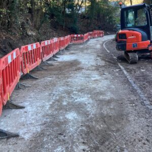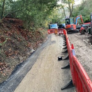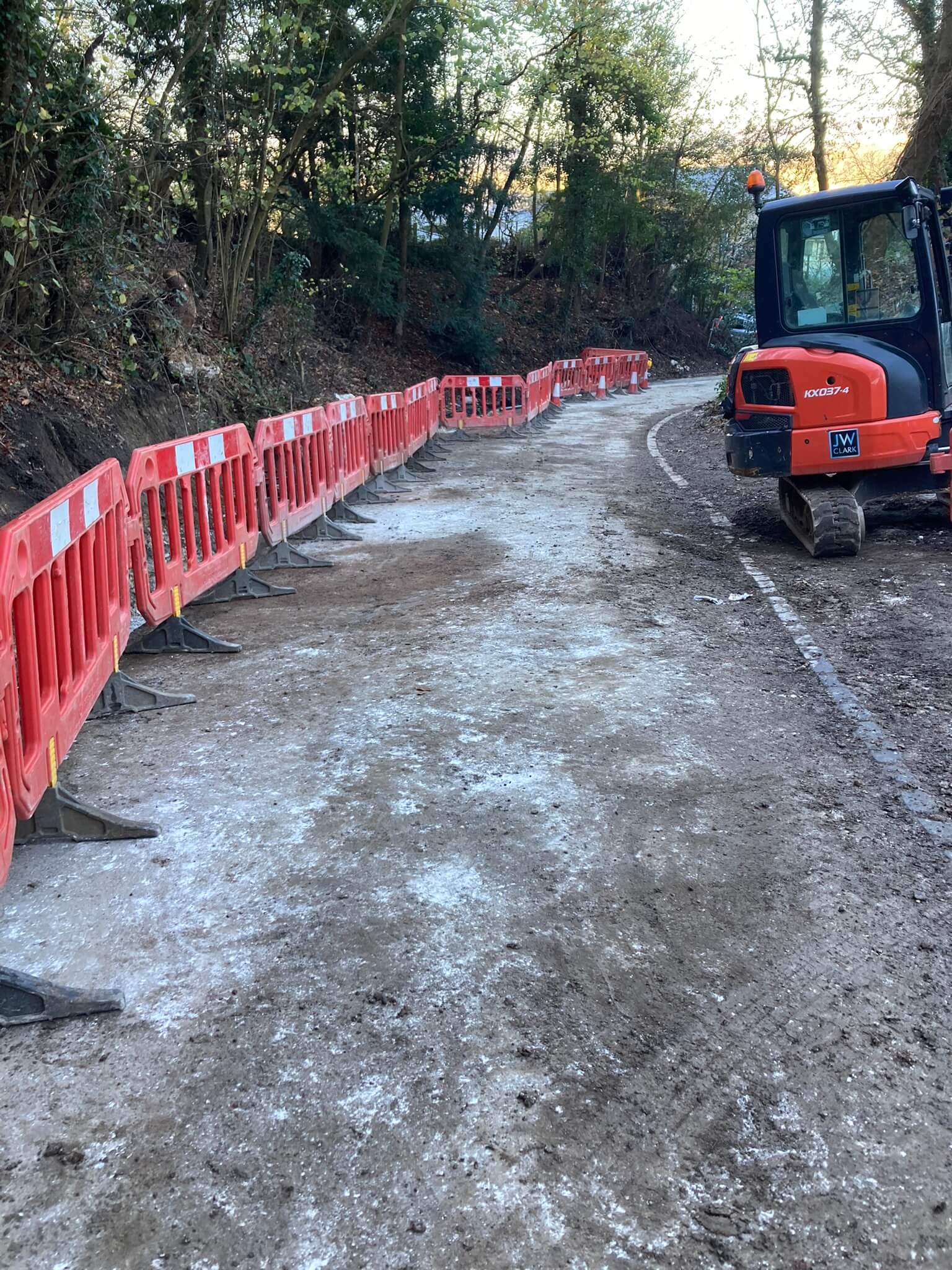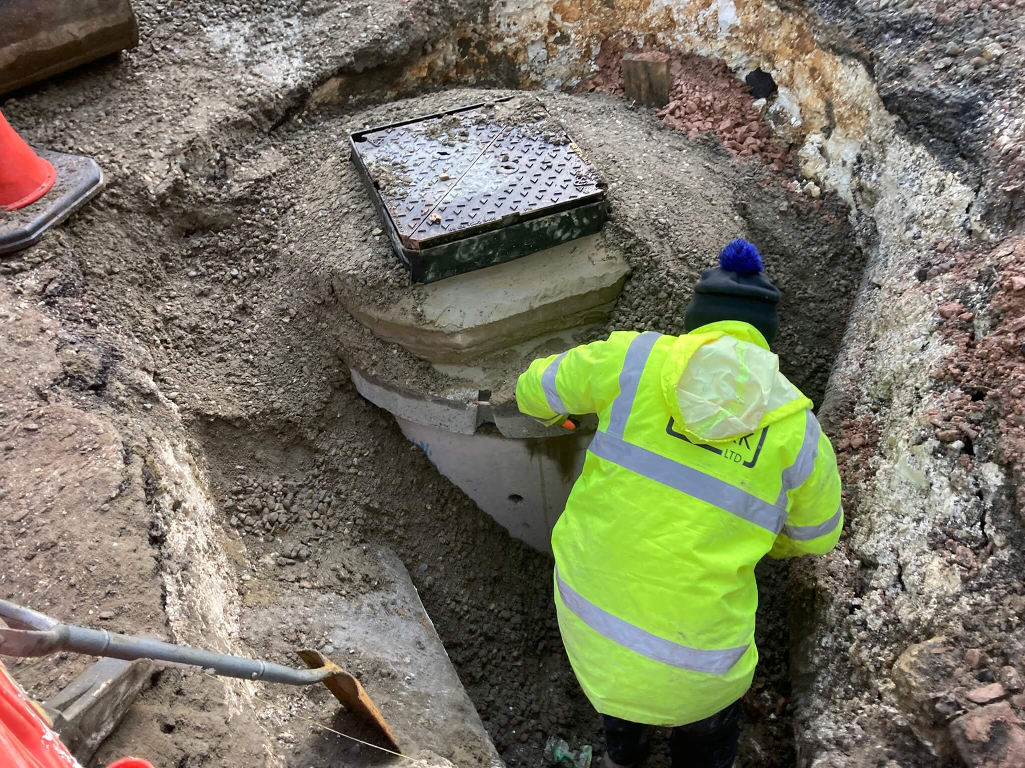 The public sewer that we needed to connect to, was at the bottom of a very narrow, single-track lane, and there was no way to carry out the works, without closing the road. As usual, we took care of all the permits for our customer, including the application to connect to the public sewer (the Section 106 application), the application to work in the highway (Section 50) and also a TTRO application – which is the application for a full road closure.